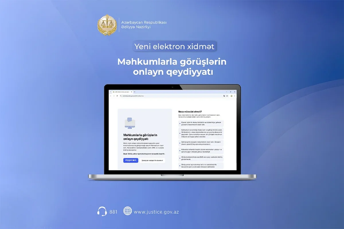 Ədliyyə Nazirliyi məhkumlarla görüşlərin daha çevik təşkil edilməsi məqsədilə "Məhkumlarla görüşlərin onlayn qeydiyyatı" xidmətini istifadəyə verib.