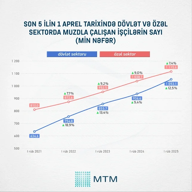 Son bir ildə özəl sektorda ortaaylıq nominal əməkhaqqı məbləği 7.4% və ya 76.9 manat artaraq 1 115.6 manata, dövlət sektorunda isə 12.5% və ya 116.7 manat artaraq 1 053.1 manata çatıb.
