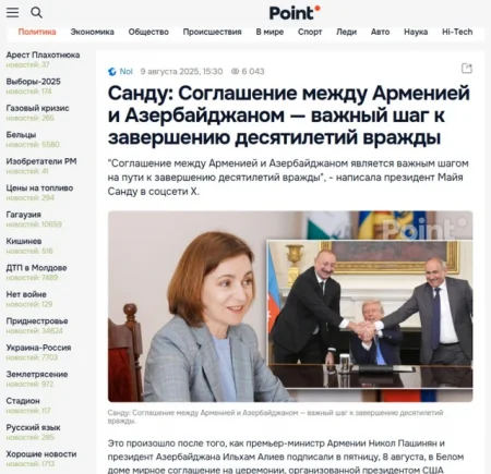 Məqalələrdə, həmçinin Moldova Prezident Maya Sandunun "X" sosial şəbəkəsində razılaşmaya dəstək fikirləri də yer alıb. Sandu bildirib ki, Ermənistan və Azərbaycan arasında razılaşma onilliklər boyu davam edən düşmənçiliyə son qoymaq yolunda mühüm addımdır. Moldova prezidenti Bakının və İrəvanın rəhbərlərini, eləcə də Prezident Donald Trampı bölgədə sülhə, barışığa və rifahın yüksəldilməsinə yol açmaqda xidmətlərinə görə təbrik edib.